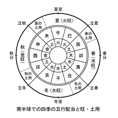 - 徐樂吾氏が説いている如く未月土用に土は旺じ、辰・戌・丑月の土用では「旺不旺」(旺とは言え旺じていない)です。従来から土の看方は大変難しいと云われて来ました。四季月の土旺と土用は峻別されるべきです。土の力量は、新しく開発した五行の旺衰細分数値化力量計算法によって、夫々の五行と共に旺衰強弱力量を誤まりなく明確に判別できます。